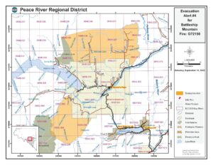 The Peace River Regional District at the Emergency Operations Centre (EOC) has issued a revised Evacuation Alert in follow up to Evacuation Order #2 that was issued on September 10, 2022 at 12:00hrs as a proactive measure to ensure that residents have time to prepare should the situation at the Battleship Mountain wildfire (G72150) change in the coming days.